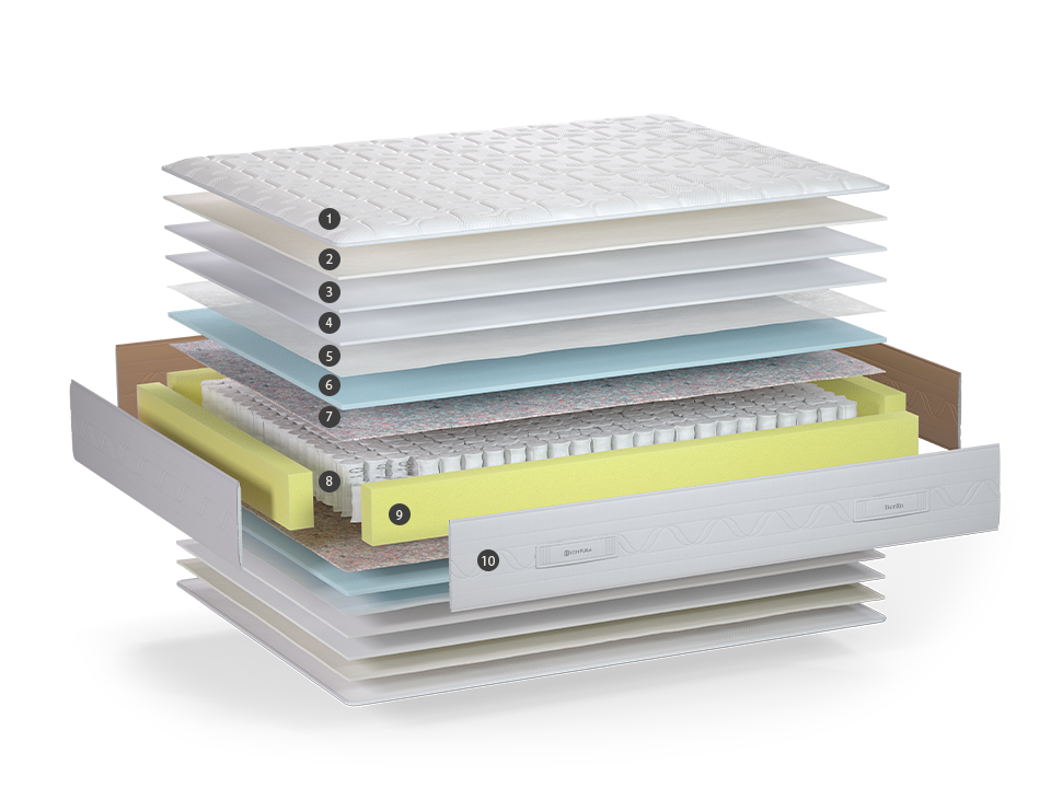 High-density frame covering the pocket spring core. Its structure extends the life of the mattress and ensures greater stability and resistance.